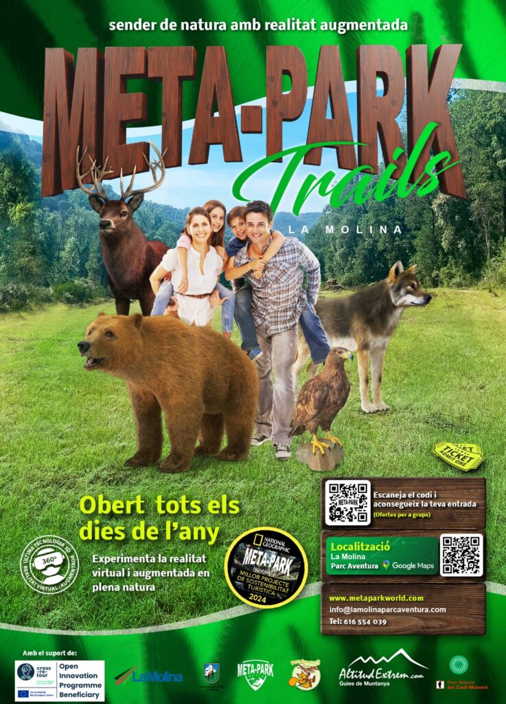· Gràcies a les ulleres de realitat virtual, podràs conèixer, emocionar-te i gaudir dels animals que habiten la Península Ibèrica (Linx, Guineus, Gall Fer, Cèrvols, … i et prepararà per gaudir encara més del recorregut del Meta-Park Trails de Fauna Pirinenca.